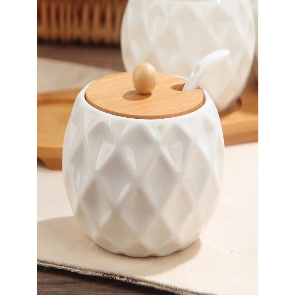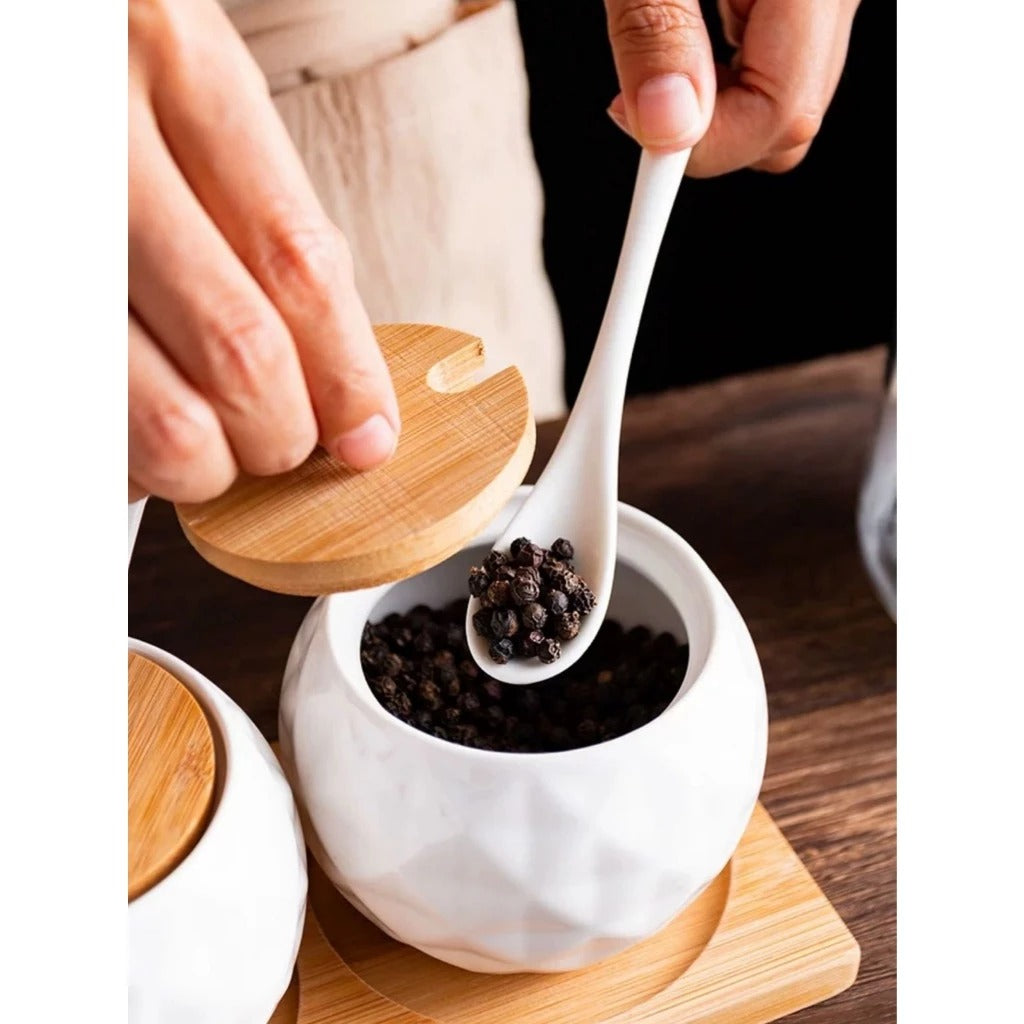 ✨ KIT PREMIUM 3 PEÇAS: Potes de Cerâmica Branca com Tampa e Bandeja de Bambu